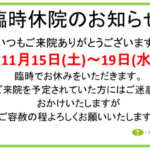 2025/11/14 / 最終更新日 : 2025/11/05 kotake 受付案内 🍂臨時休院のお知らせ🍂 臨時休院のお知らせ いつもご来院いただきありがとうございます。 誠に勝手ながら 11月15日(土)~19日(水) の期間、臨時休院とさせていただきます。 患者様にはご不便をおかけいたしますが ご容赦の程よろしくお願いいた […]